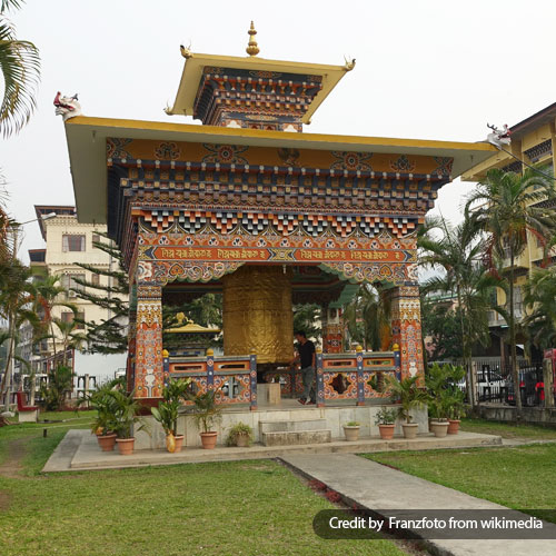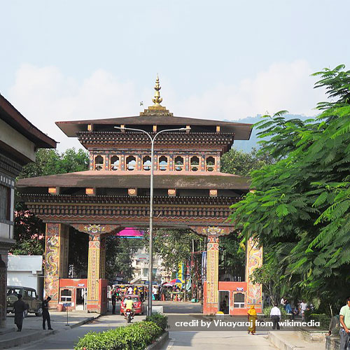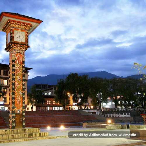 The Clock-tower is a typical Bhutanese architectural structure decorated with carvings and paintings. The four faces of the tower are handcrafted and painted in golden dragon symbolizing the county as an independent dragon kingdom. Other sources of attraction here include the water fountains and traditional Bhutanese prayer wheels (Mani Lhalhor).